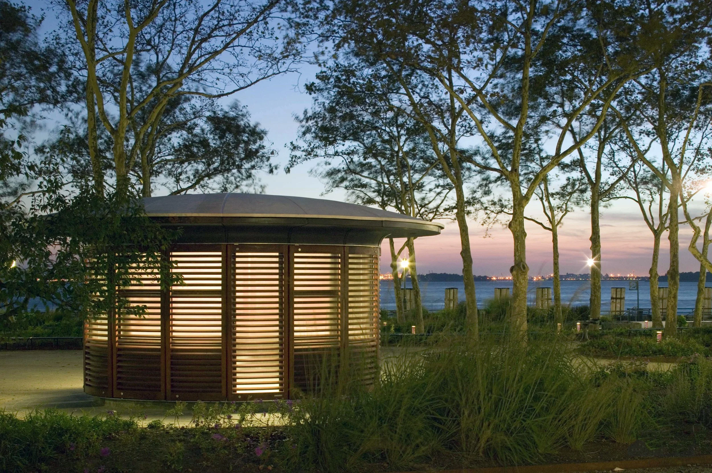 The lighting of the slatted wood kiosks in the Battery Bosque was a key component of the overall strategy to create an enchanted nighttime experience of the Bosque. Nestled among a grove of 140 mature London plane trees, the Bosque features 34,000 perennial plants and 70,000 bulbs, 1,500 linear feet of serpentine benches, a 60-foot wide spiral fountain and two distinctively designed food kiosks. The slatted wood kiosks are lit like lanterns in the landscape, a strategy that helps to reduce the number of luminaires needed while providing a shielded, soft focal glow.