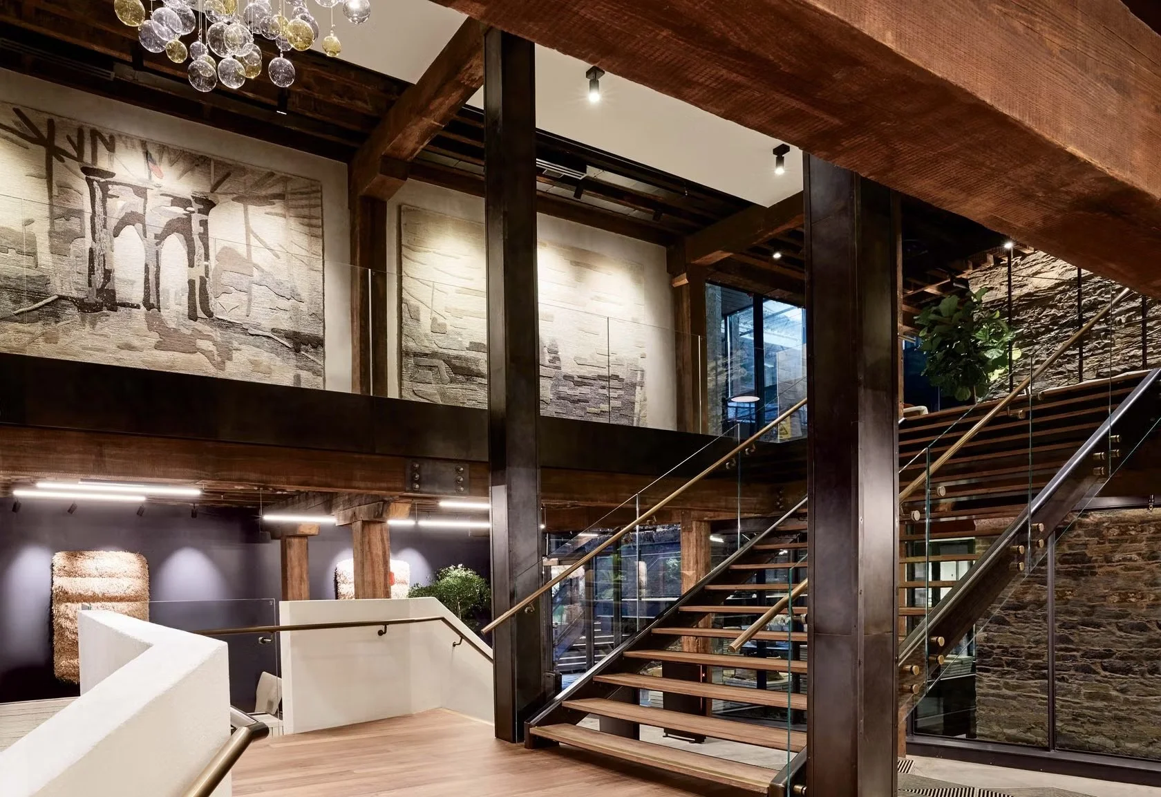 The West Elm Corporate Headquarters is located within the landmark Empire Stores, the new Brooklyn Bridge Park cultural complex along the East River. Listed by the National Park Service as a historic site, the series of former industrial warehouses from the 1870s and 1880s had been largely abandoned for decades before redevelopment began in 2013. New York–based VM Architecture & Design (VMAD) collaborated with West Elm and its parent company Williams Sonoma to design the 137,500-square-foot interior for 300 employees on the second and third floors of the former coffee roasting plant and warehouse.